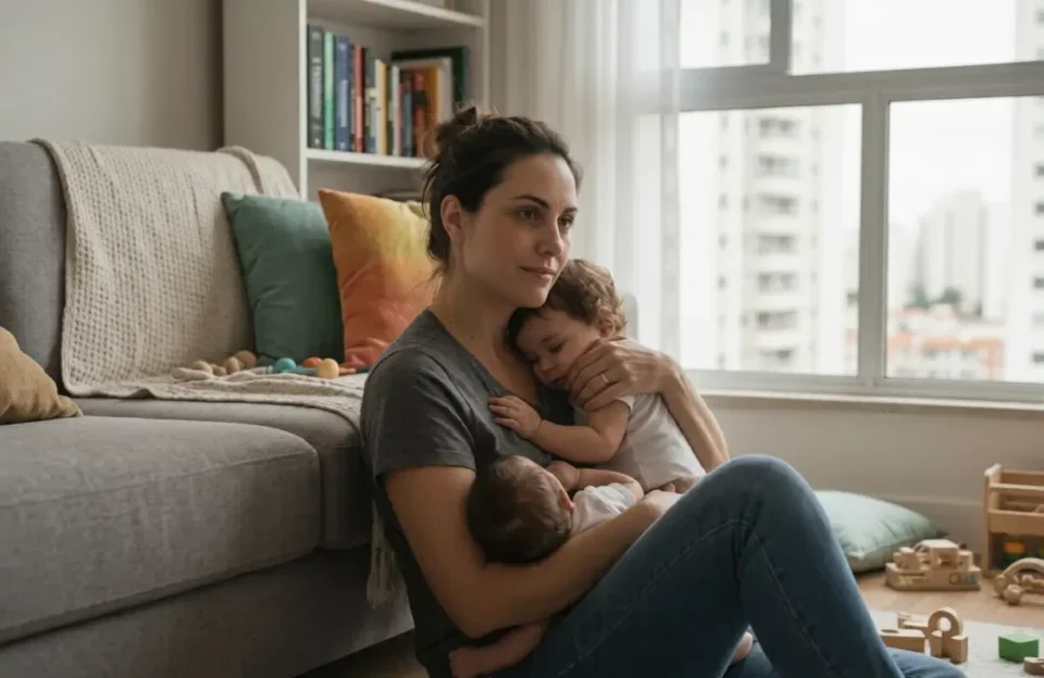 Mãe brasileira de gêmeos sentada em sala de estar urbana com expressão introspectiva, segurando os bebês, ilustrando a neurobiologia da maternidade e o cérebro sob estresse
